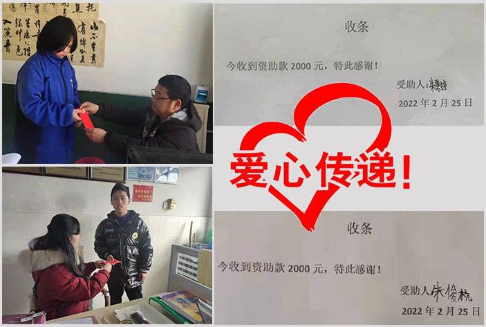 今年年初,公司与兰溪黄店镇朱家小学的贫困生朱碧婷、朱俊杭结成对子,为他们送去慰问金,鼓励他们积极面对生活中暂时的困难,努力学习,早日学有所成。