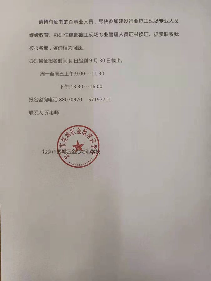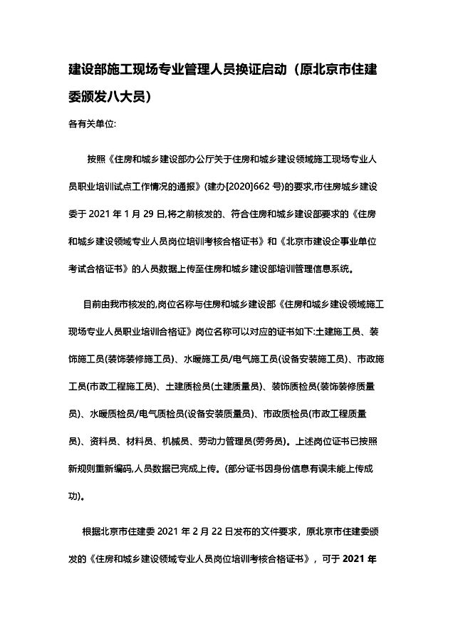 建设部施工现场专业管理人员换证启动(原北京市住建委颁发八大员)